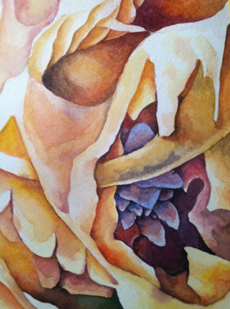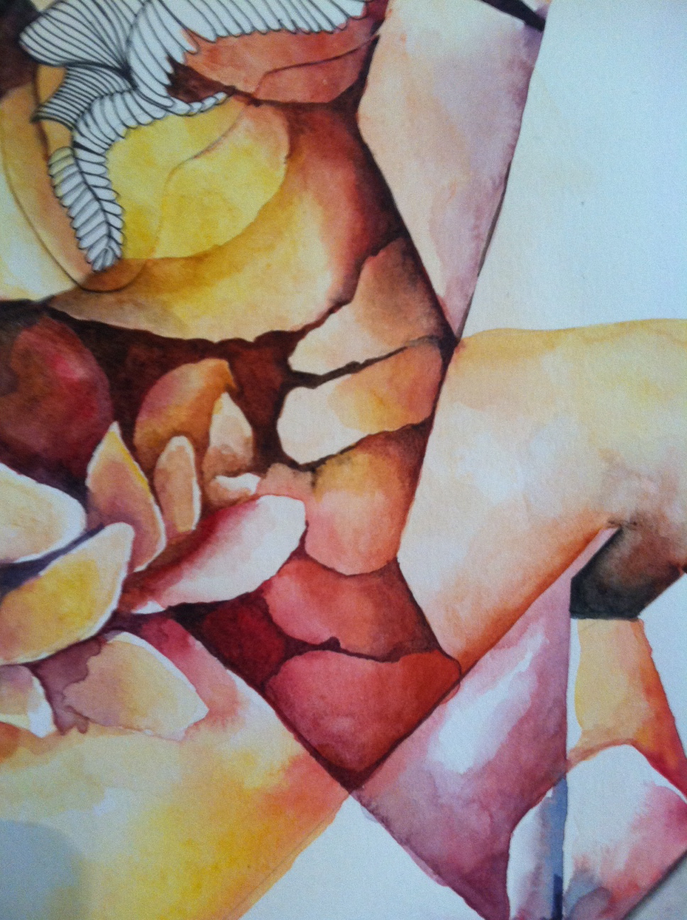 It’s been a week so far and its Wednesday. As some of you may know I’ve had a cold for like nearly a week now and it keeps evolving into different stages. The EVIL scratchy throat phase, that feels like a cougar tore it up for fun, the awkward unbalanced phase, where you can’t hear anything anyone says to you so you just shake and nod, the uncontrollable snot phase, where any sneeze may result in a fucking eruption of buggers (sorry its gross I know) and the current phase, Coughing Fits. Meaning, that I’ll think you’re grand, I’m fine just a sniffly nose and then the tickle comes and you know that in a matter of seconds a full blow coughing fit is about to follow. So you ungracefully excuse yourself from whatever situation your in; Driving your car while having an interesting phone conversation with your sister, discussing the obnoxious people you have to deal with at work all day or right in the middle of a somewhat serious conversation with your spouse about your future. Either way, BAM! its here and it will be for a few minutes, so accept it. Needless to say this has been my life for about 3 days now and since I am sick of having to excuse myself to go and die in the work bathroom, which at this point I’m sure people think a dying cow is living in there. So I just stop talking to people and start painting. This was the end result, 3 nights of just developing what initially was a hott mess. Now I can confidently say I am somewhat fond of this image. Yay me! My husband, who is wonderful and supportive, but had no idea what I was trying to do stated two things. His first response was, looks like a volcano. What? no no no. His second comment was, I like how it looks like layers or something. YES, that was one of the goals and he got it. I was happy that the color pallet was less rainbow-ish too, as that is a continuously obnoxious theme in my current works. Enjoy and see you next time.