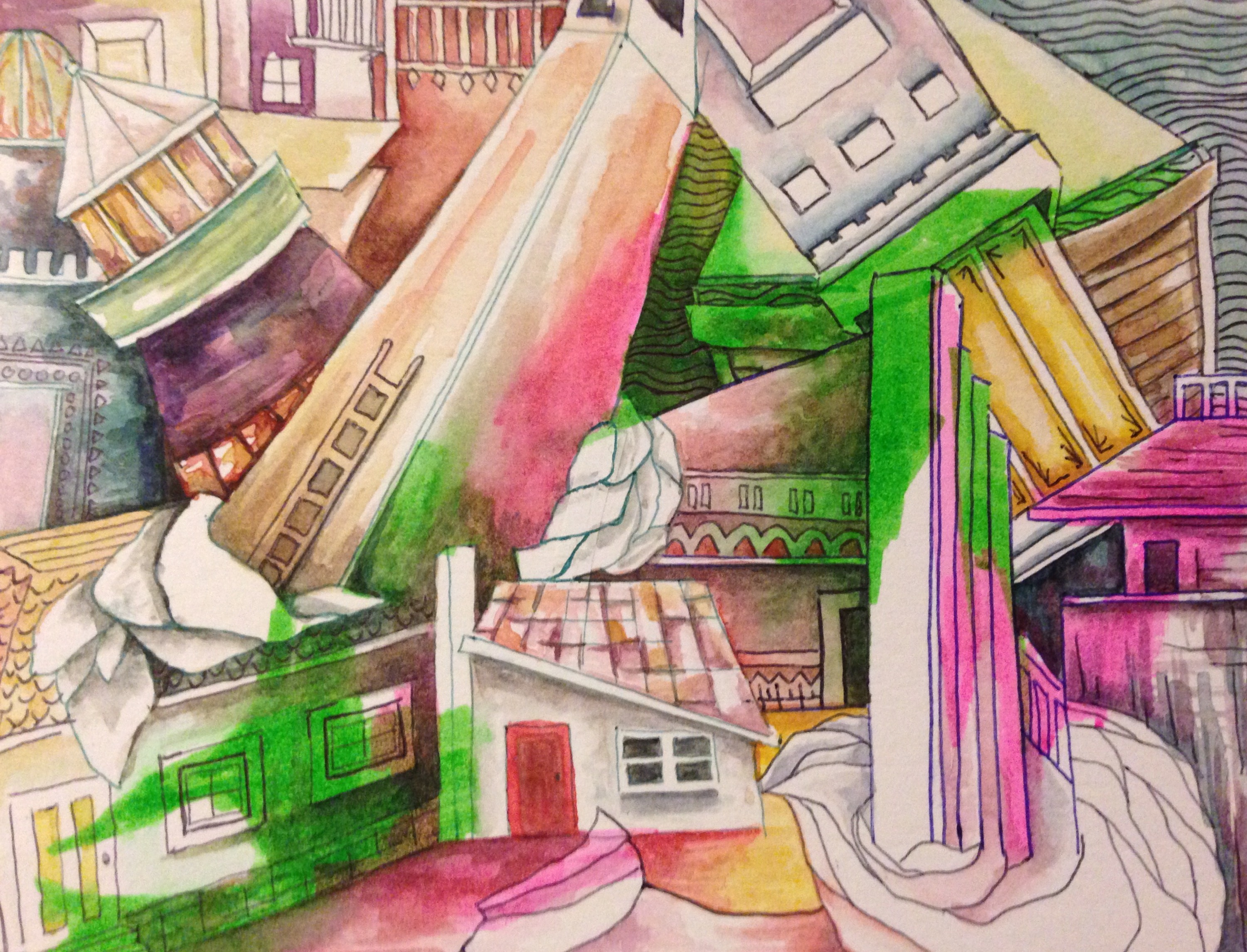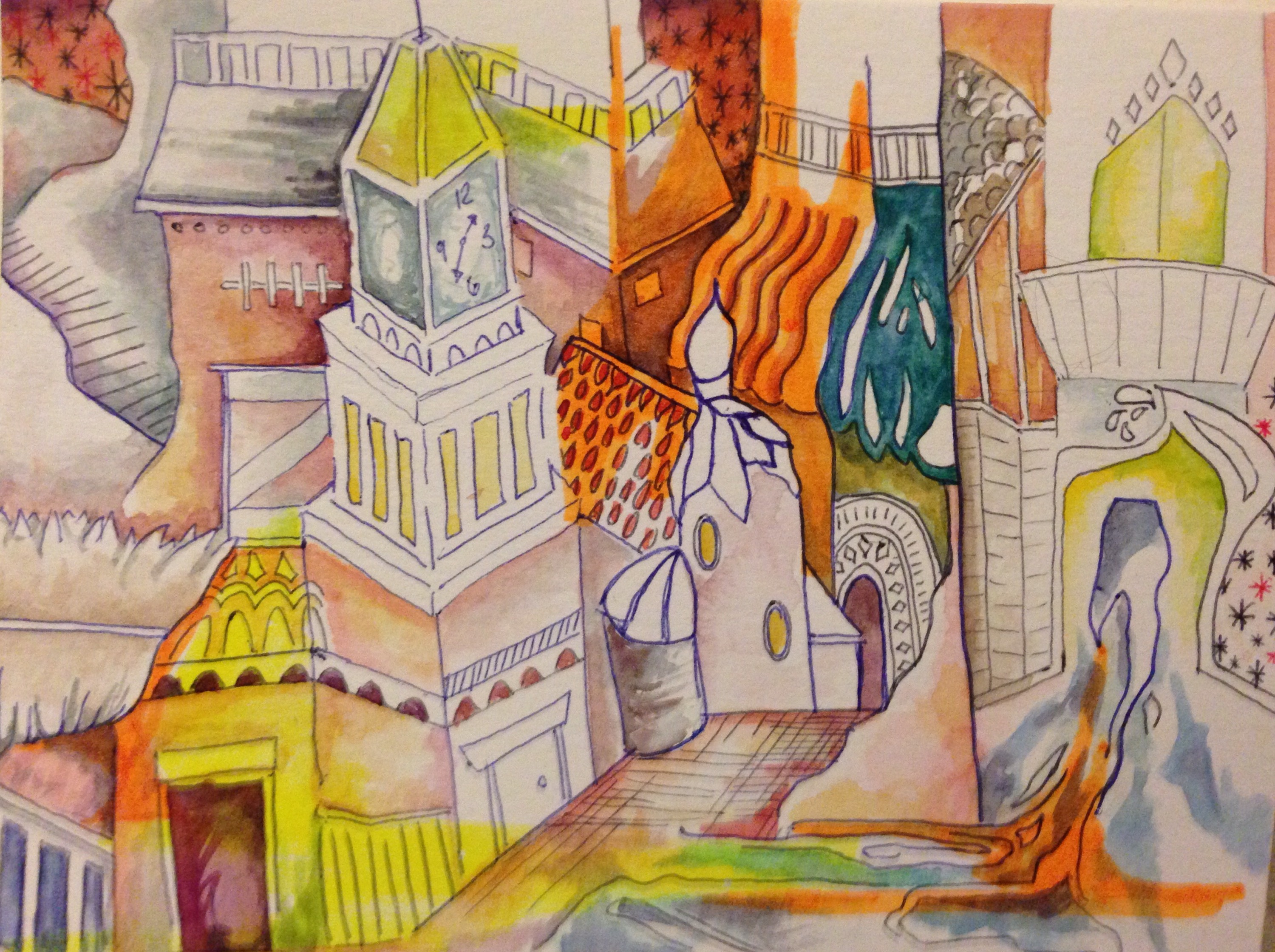 When you start drawing buildings and allow your pen to just go this is sometimes the result. Initially starting with the clock tower the buildings began to take on influence from Indian Culture. I am probably watching too many shows on Indian food as it is a new obsession. The color is mental but that was due to an orange highlighter. I went a bit crazy with it and naturally as soon as the brush hit those areas the orange leached into whatever color I tried to put near if forcing the image to have an unintended warm glow. Enjoy and see you next time.