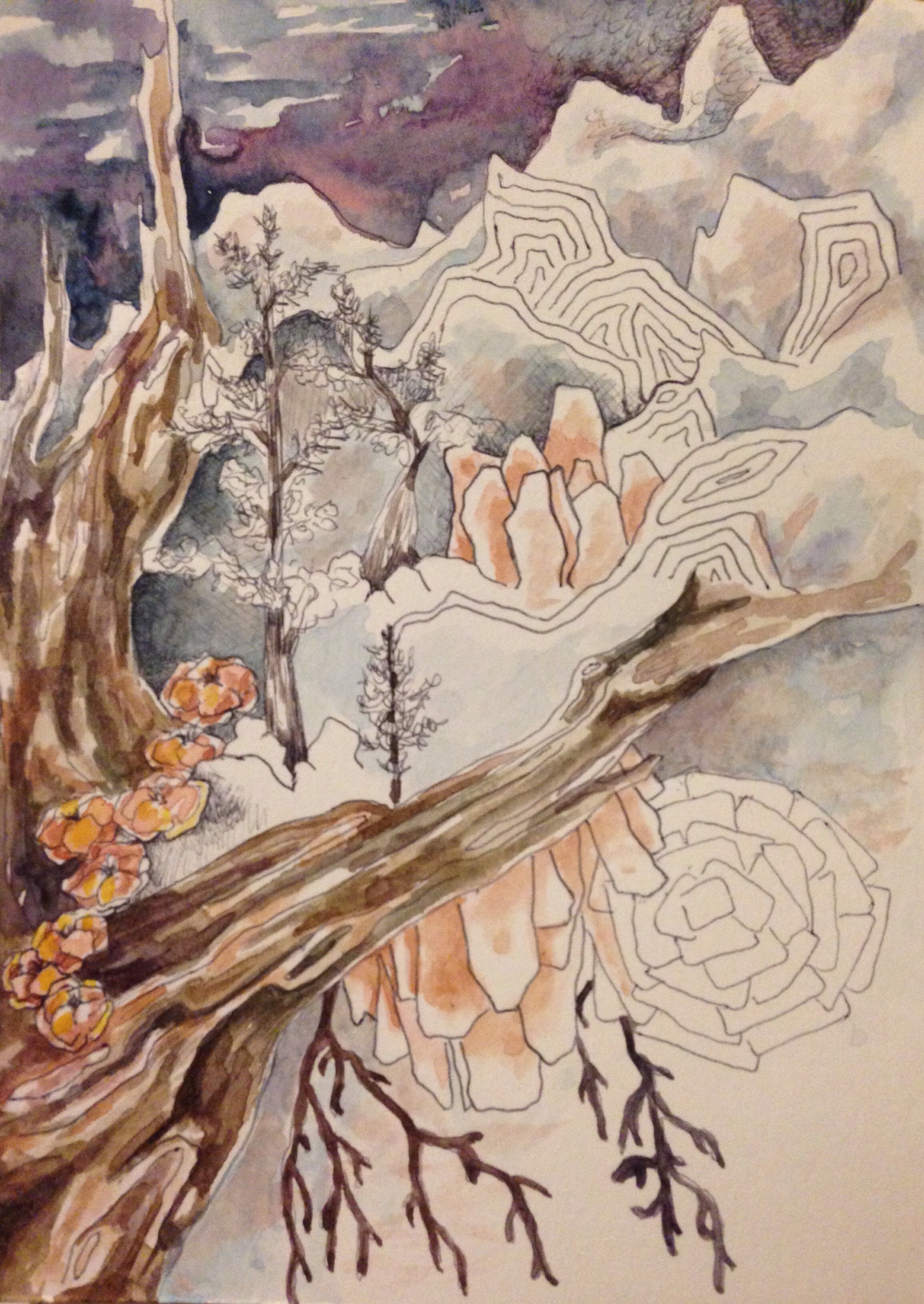 Last post of the day, I promise! I tried to integrate the cooler tones I was seeing outside into this image. Simultaneously, there was a documentary on a mountain range in California which I found inspiring and used as a reference tool. I love the mountains and cannot wait for my hiking season to begin. I only hike from Spring to mid fall as I do not own the winter gear but have always been in awe of those who are brave enough to go out. They must experience such quiet calm moments along the way. When hiking the mountains I find that my favorite moments are when I can hear nothing else but the wind passing through the trees. Enjoy and see you next time!