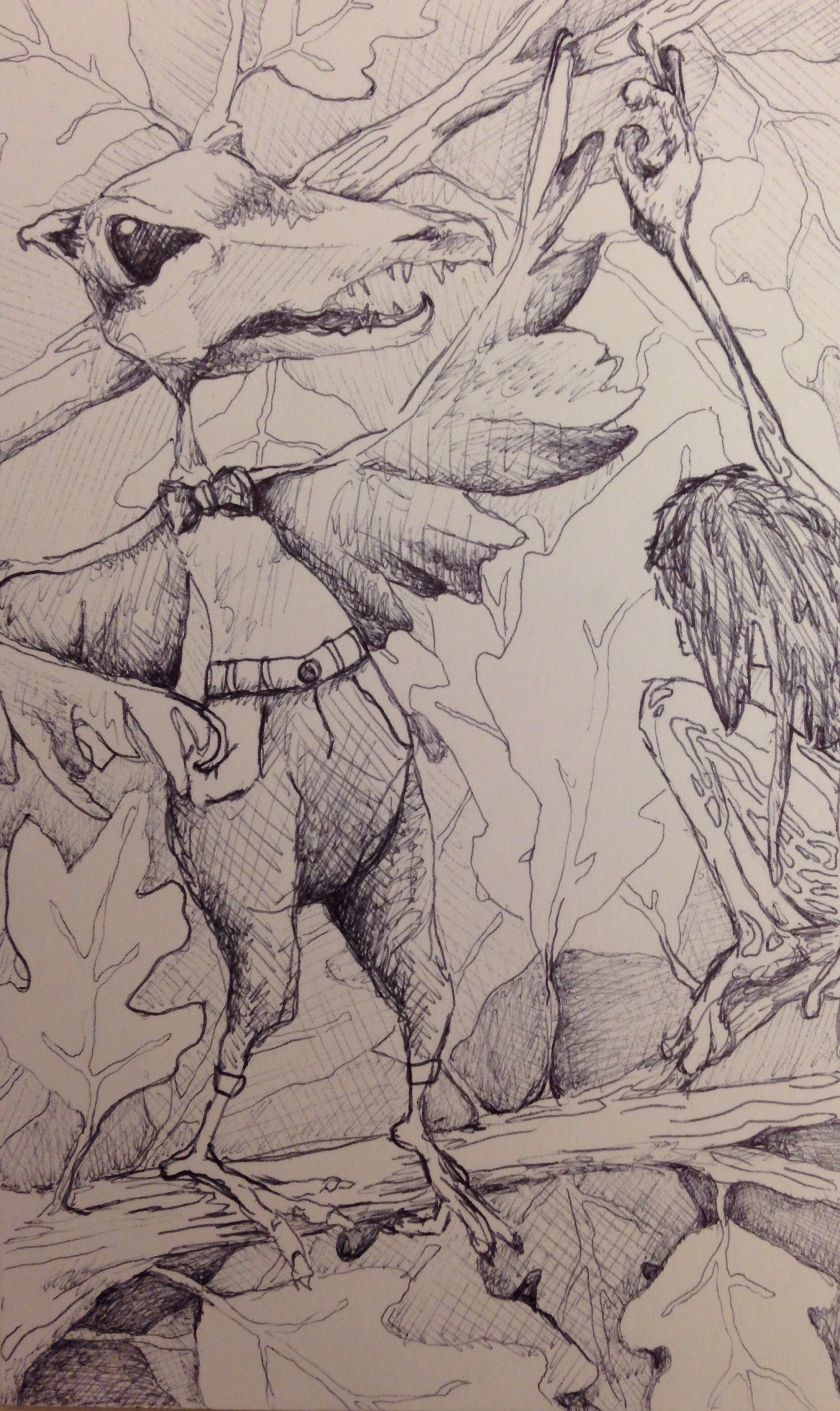 Decided to draw in bed this time. Winter has definitely taken a toll on me, whether it be mental or physical could be debated but either way I’m exhausted. At times in the evening I find myself drifting away into a space filled with random thoughts, ideas or images. Last night, when I closed my eyes in bed I started to image a creature. Somewhat like a bird, kind of like a skeleton but having roots in the human figure. The face came first and I think its apparent as it seems the most thought out or maybe it appears that way because that was already an image in my head. Either way the image developed from there and what made it fun was the lack of thought. No stress,  just me, a pen and a sheet of paper.  Enjoy and see you next time.