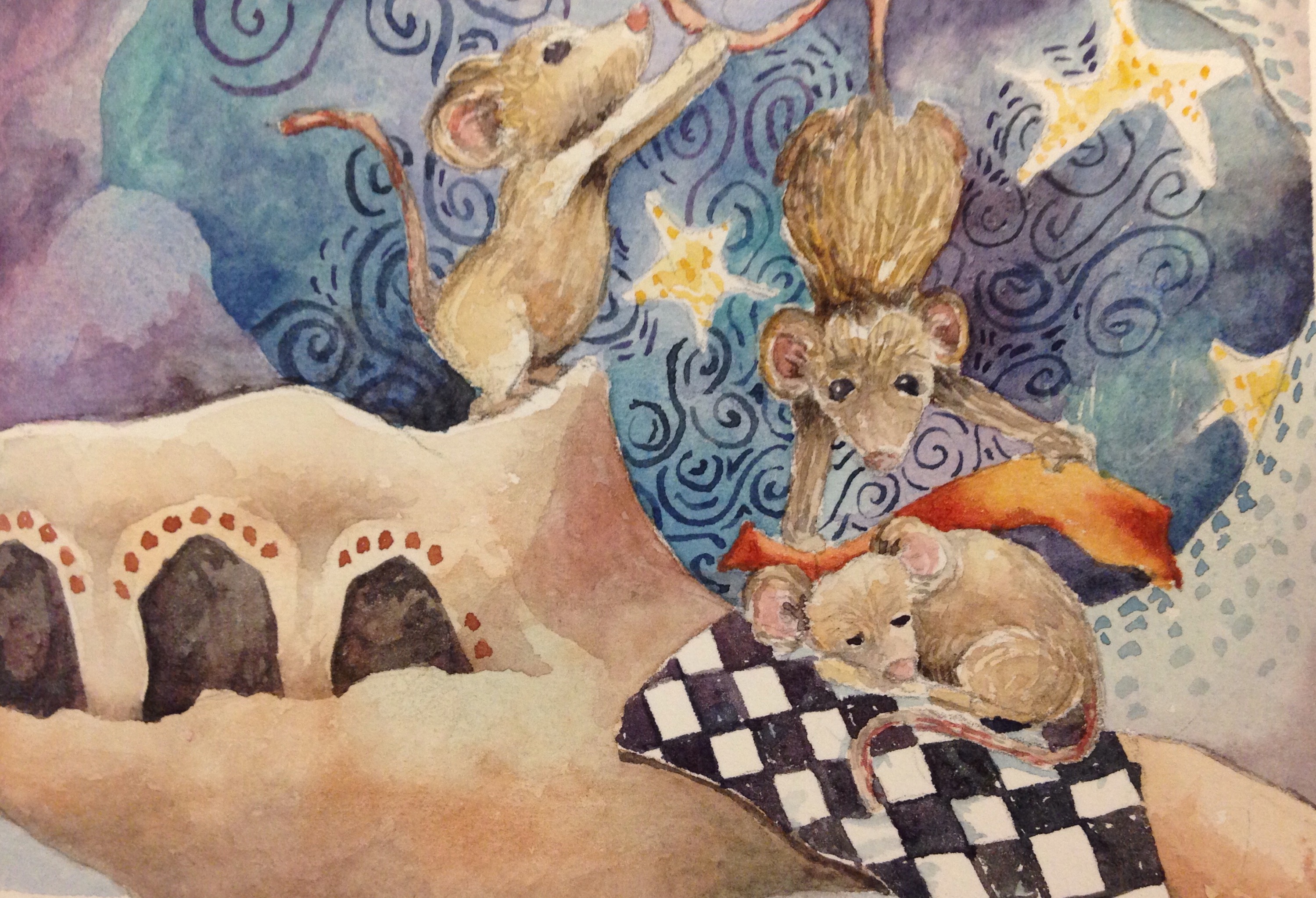 Continuing with these studies, this image got a bit more involved. Working to create a story line while practicing these figures. I love the blanket about to cover the sleep mouse. The hanging guy looks like a monkey but I guess I know what not to do next time! Enjoy.