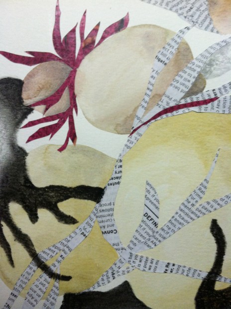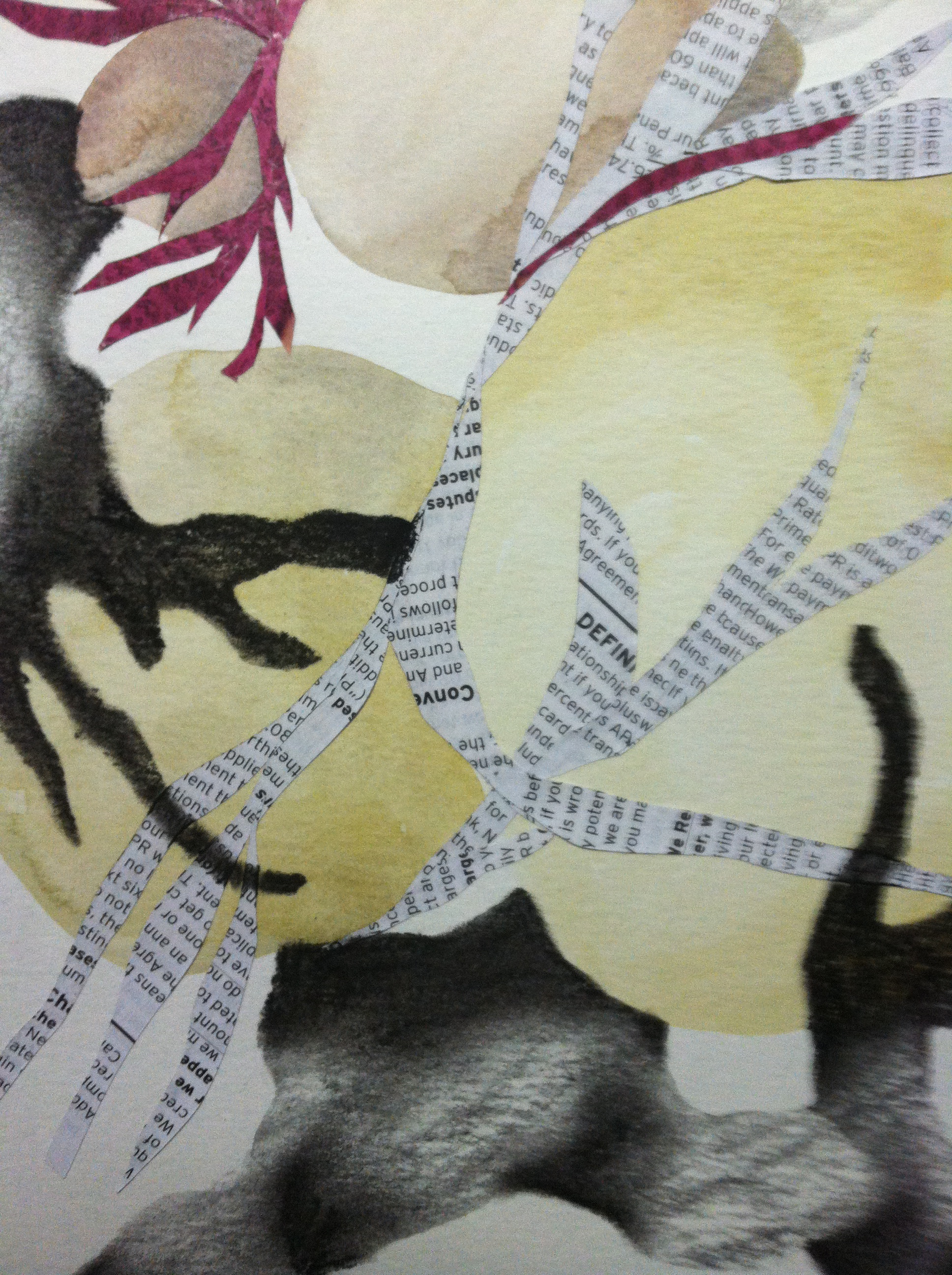 Today was a bit of an experiment with layering. I went to the Cohasset Art Fair today which opened at 2pm and went through the tent to look at all the artwork. This was the show I had tried to get into. I actually think that my pricing may have been too high for a lot of the show, seems like if you don’t have a name for yourself you works should not cost over $600 and all of mine did. Oh well you live and learn. I did see one really interesting mixed media piece which inspired me to cut up the paper (which has absolutely no significance to me, it was a Citibank credit card brochure). Also, while I was there I ran into an old friend, Mr. Rodger Tirrell, who most of my friends know as our art teacher from High School. It is always such a pleasure to chat with him. Anyway, as I said before this was just an experiment and far from a completed piece. Anyway, Enjoy and I’ll see you tomorrow.